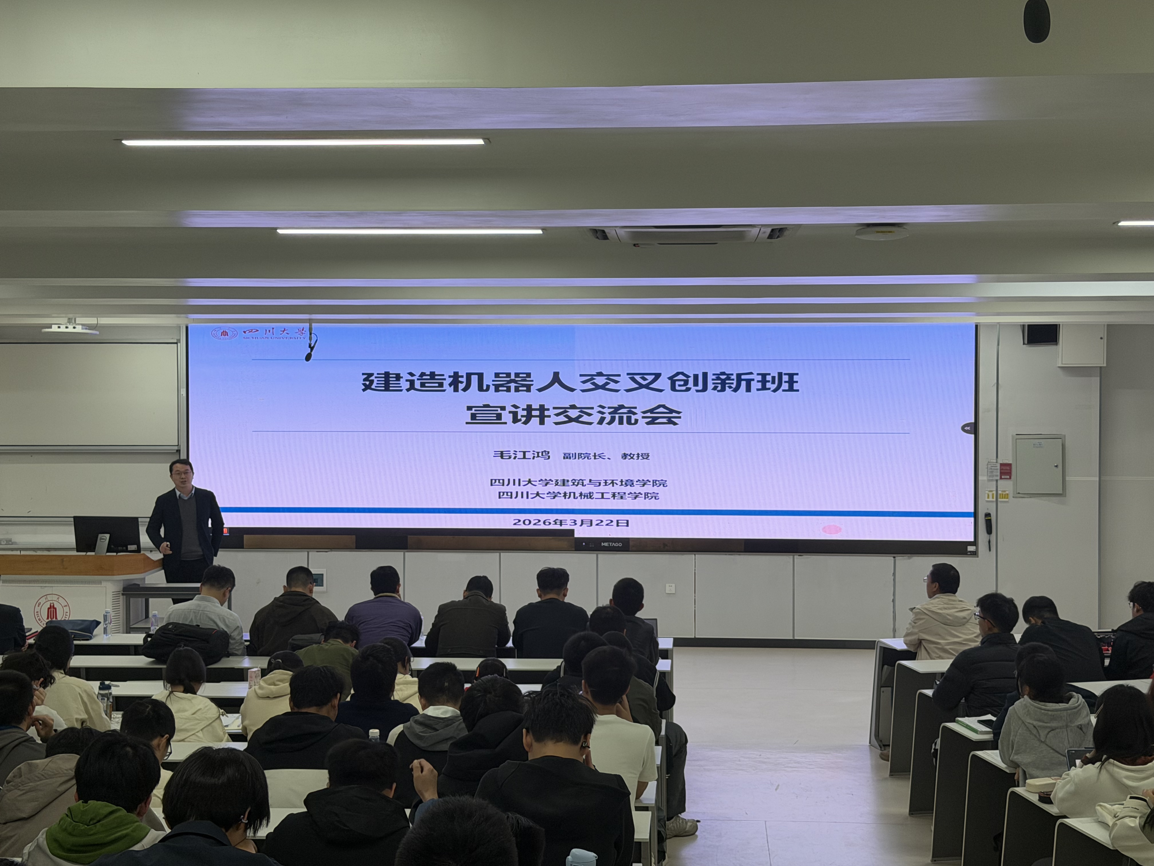 3月22日,建筑与环境学院在江安校区举行“智造未来:建造机器人行业发展前沿报告暨四川大学建造机器人交叉创新班宣讲交流会”。中国五冶集团智能建造工程技术研究中心主任易富民,学院学术院长熊峰、副院长毛江鸿、土木工程系全体班子成员以及交叉创新班教师代表和学院2025级全体本科生共同参与。土木工程系支部书记阎慧群主持会议。