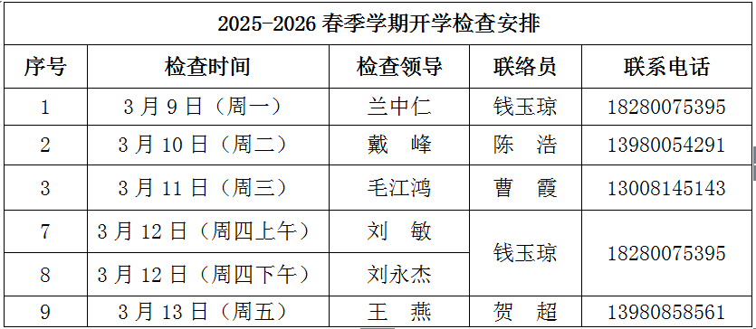 为确保新学期本科教学工作有序开展、保证高标准教学质量,学院在2025—2026学年春季学期,持续加强教学监控与管理,严格按照学校教务处关于开展开学教学检查工作的文件精神和工作要求,组织学院领导班子、教学管理人员、教学督导人员对学院开学初教学工作安排、课堂开展状况、教材保障及选用情况等进行了全方位检查。开学检查安排见下表: